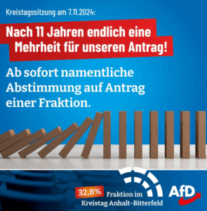 Vor 3 Monaten scheiterten wir noch mit unserem Antrag auf namentliche Abstimmungen im Kreistag Anhalt-Bitterfeld, wenn diese Abstimmung durch eine Fraktion beantragt wird. Nun bekamen wir dafür eine Mehrheit.